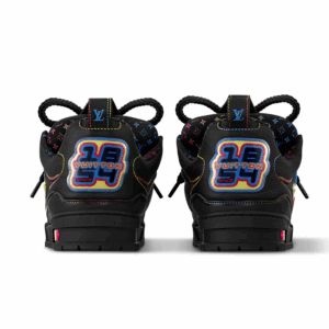 The LV Trainer sneaker is reimagined in a bold black palette with vibrant rainbow accents.