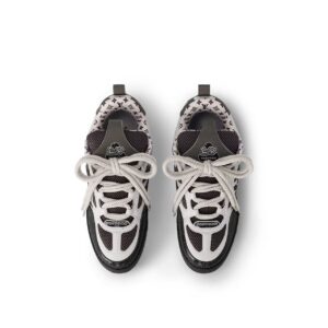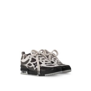 The LV Skate sneaker is revisited this season in a mix of materials, including technical mesh. The design references Nineties skate shoes and features a technical lining with a Monogram print and extreme padding for optimum comfort. This bicolor model incorporates a Monogram Flower on the side and three Monogram Flowers on the outsole.