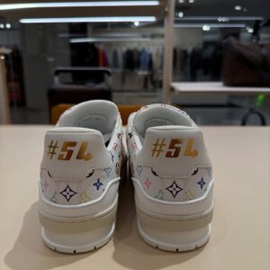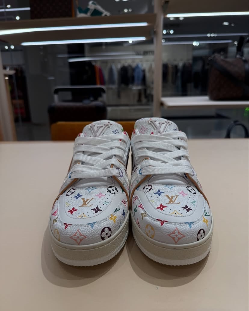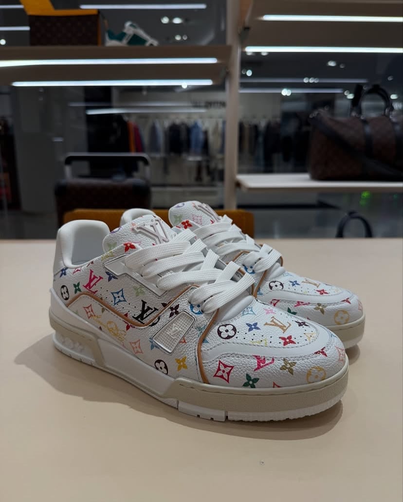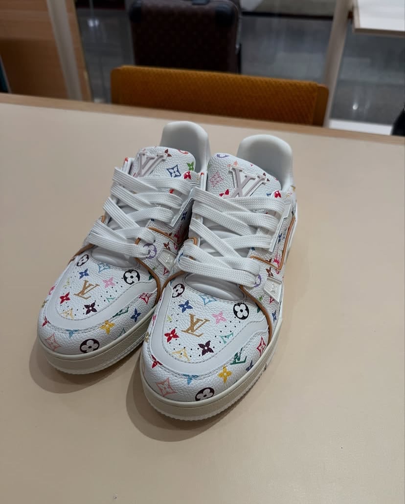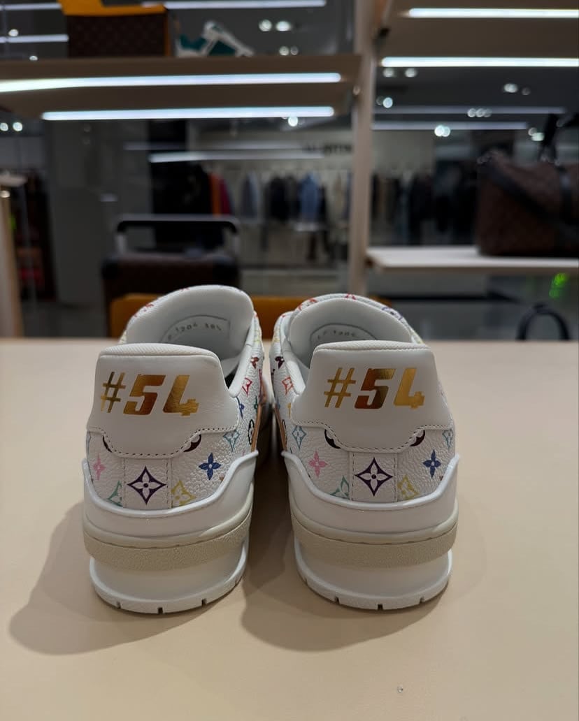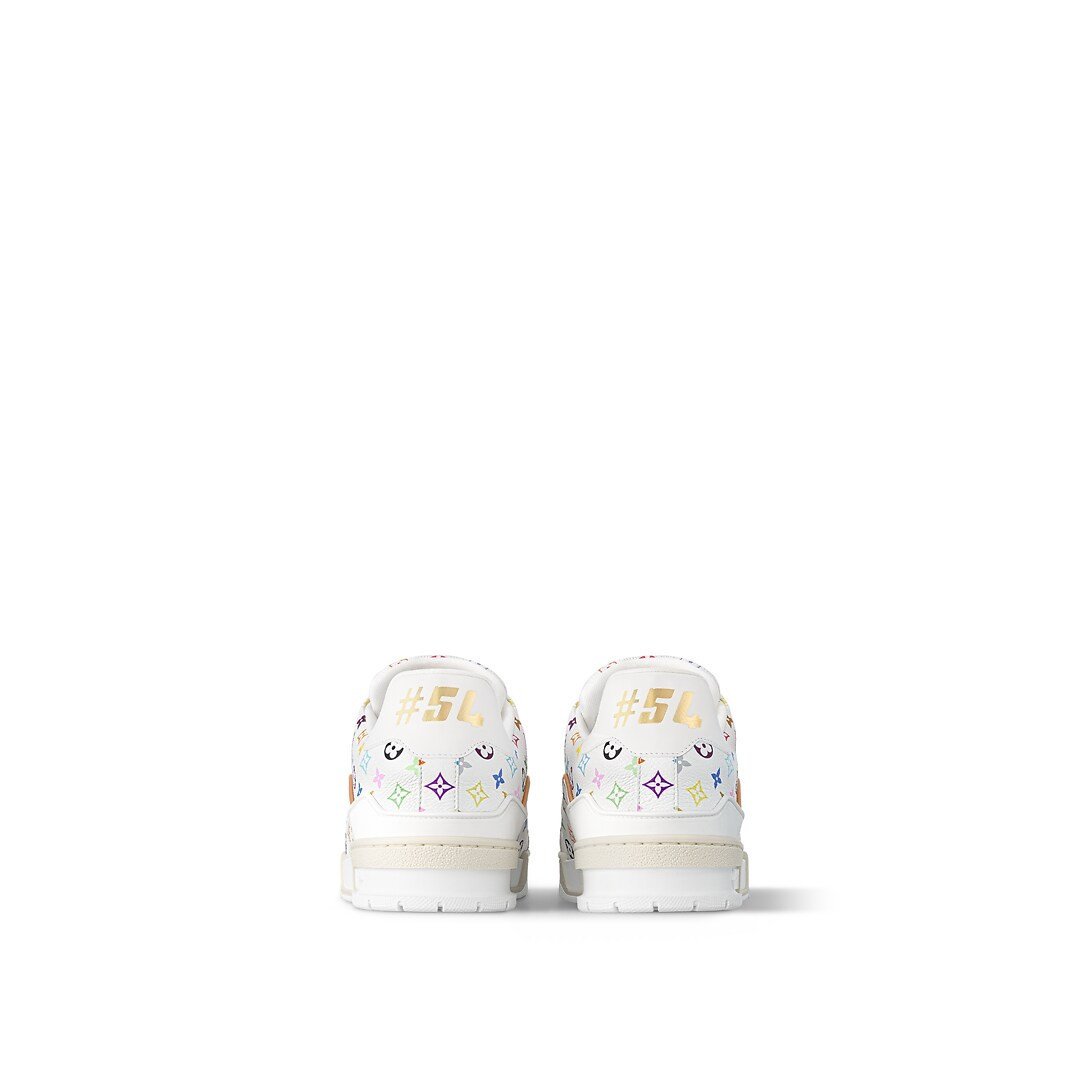 A fresh take on the iconic LV Trainer, reimagined with premium grained calf leather and a vibrant multicolor Monogram print, inspired by the lively artistry of Takashi Murakami. The silhouette blends dynamic energy with a classic touch, featuring a stylized Louis Vuitton logo and the number “54” on the heel—paying homage to the Maison’s founding year, 1854.