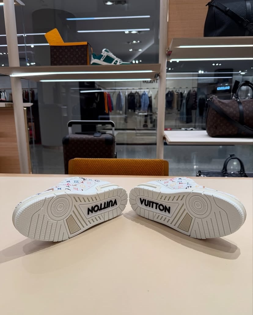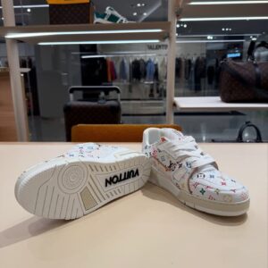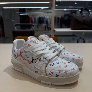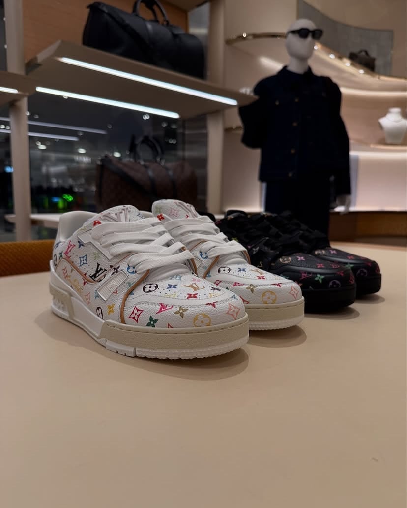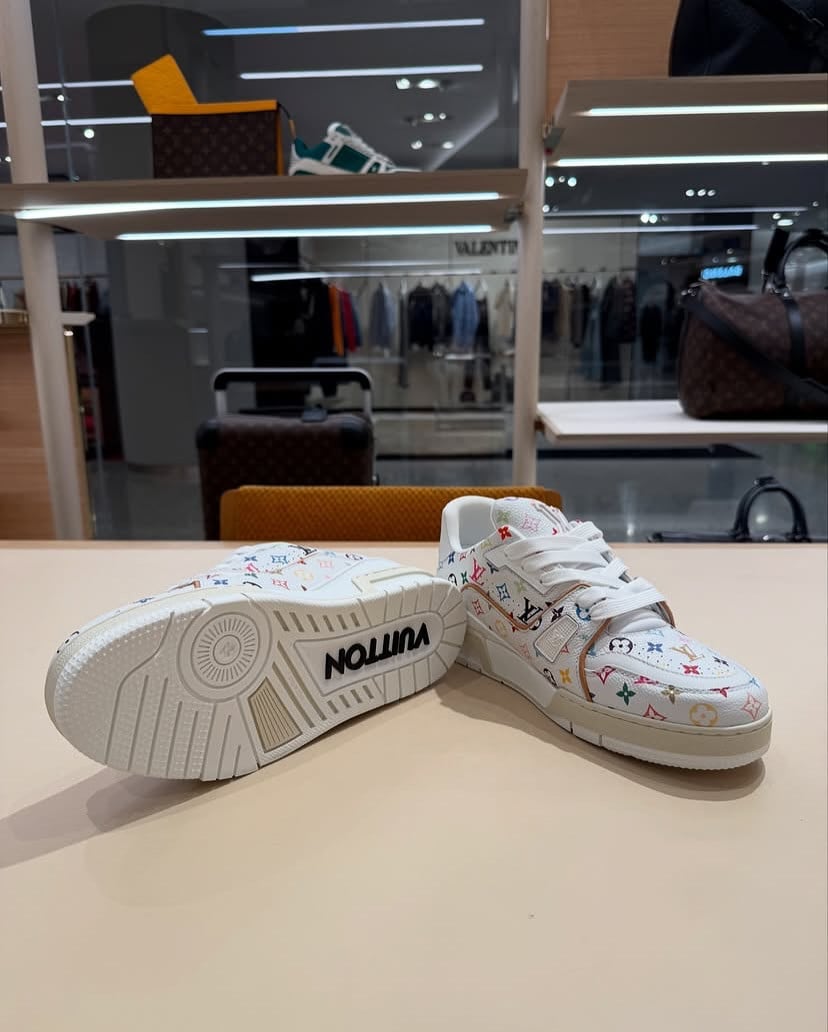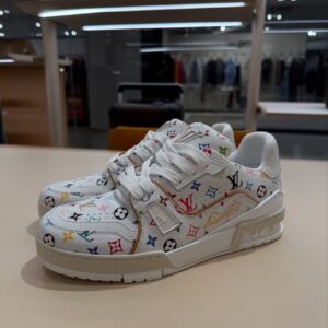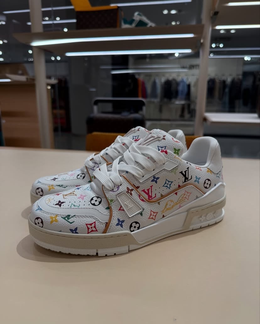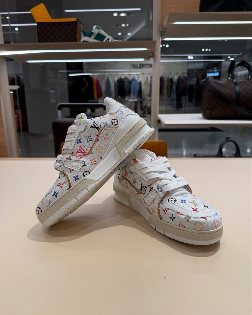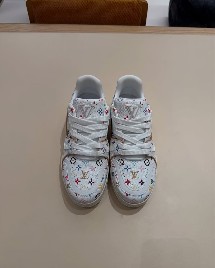 A fresh take on the iconic LV Trainer, reimagined with premium grained calf leather and a vibrant multicolor Monogram print, inspired by the lively artistry of Takashi Murakami. The silhouette blends dynamic energy with a classic touch, featuring a stylized Louis Vuitton logo and the number “54” on the heel—paying homage to the Maison’s founding year, 1854.