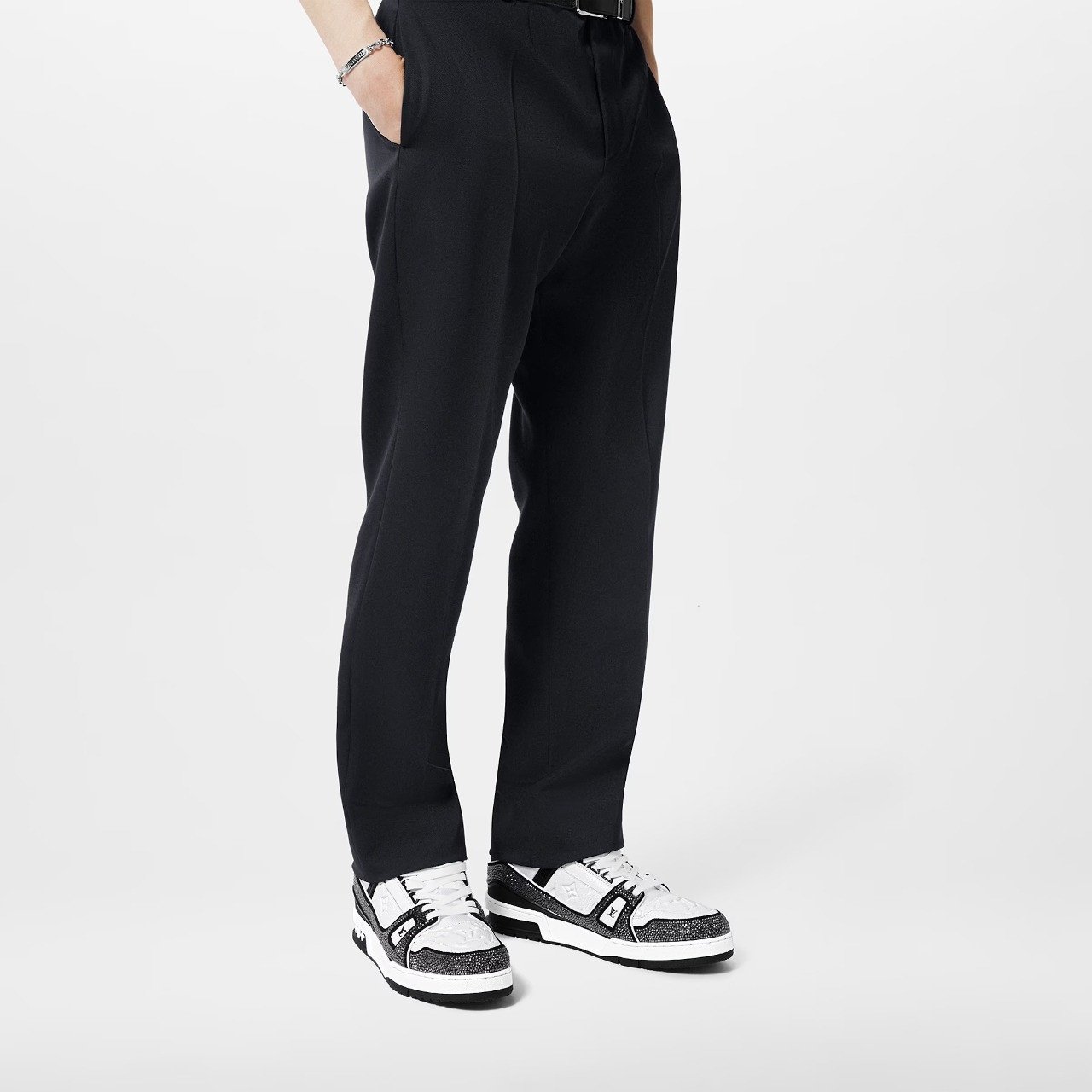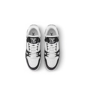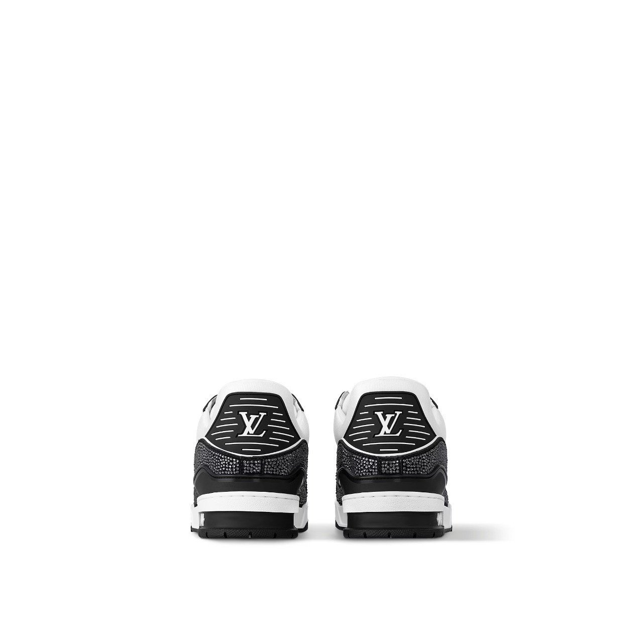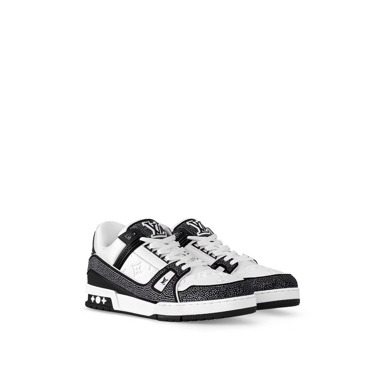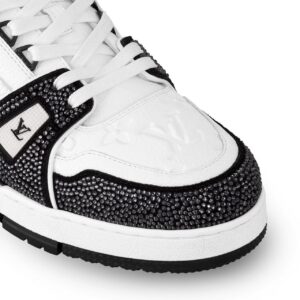 This exceptional edition of the cult LV Trainer sneaker combines grained calf leather with sparkling Swarovski™ crystals on its graphic, bicolor design. Designed by Louis Vuitton Artistic Director Virgil Abloh, this iconic style was inspired by basketball sneakers. This cult sneaker is notable for its elaborately constructed upper, which takes seven hours to stitch, and for its rich details, including a bicolor rubber outsole decorated with Monogram Flowers.