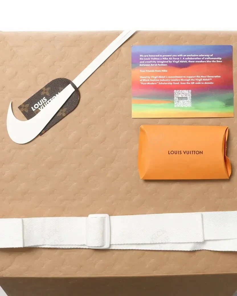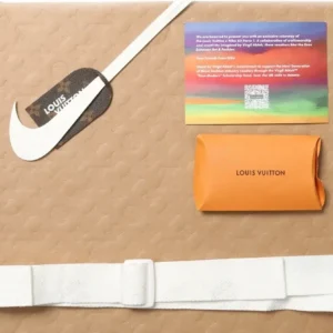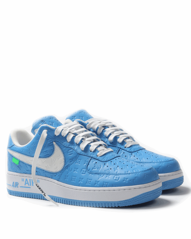 Louis Vuitton and Nike expression of the “Air Force 1” by Virgil Abloh. The LV monogram debossed throughout the upper and Swoosh. Signature Off-White details are also found, like the off-center tongue label, bright green tabs, and the quoted “AIR” text across the midsole/laces.