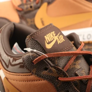 Featuring a brown suede toe box and side panels, the upper is accented with authentic LV monogram overlays and a gold Swoosh that adds a rich contrast. The tongue boasts classic Nike Air branding in gold, while the midsole is printed with “VUITTON” in Off-White™-inspired quotation marks, paying homage to Virgil Abloh’s design language. A white midsole and gum outsole complete the look, delivering both style and comfort.