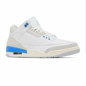 The Air Jordan 3 Retro ‘Lucky Shorts’ shoes take cues from the UNC shorts Michael Jordan wore underneath his Chicago Bulls uniform. A white tumbled leather upper gets complementing grey suede forefoot and heel overlays. Powder blue eyelets match the Jumpman logos on the tongue and heel tab. More blue engulfs the heel of the off-white midsole, which contains an Air-sole united backed by a grey rubber outsole underfoot.