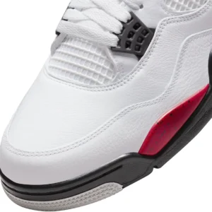 The Air Jordan 4 Retro GS ‘Red Cement’ for big kids blends the classic color blocking with a recognizable palette inspired by Chicago. Breathable netting appears on the quarter panel of the white leather upper and is contrasted by black molded eyelets. The sneaker is equipped with a two-tone polyurethane midsole, housing visible Air-sole cushioning and reinforced by a rubber outsole with herringbone traction pattern. The distinctive support wings of the shoe are adorned with crimson accents and speckled black detailing, matching the Jumpman logo on the heel tag. Another Jumpman logo is present on the Flight tongue tag.