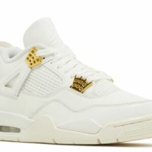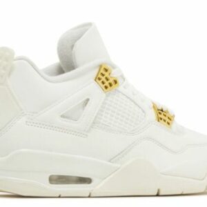 The Air Jordan 4 Retro ‘Metallic Gold’ has a smooth leather upper with a subtle off-white finish and metallic gold eyelets for a regal look. These shoes have a breathable quarter panel netting and a debossed Jumpman logo on the tongue. The prominent molded heel tab backs a plush collar. Underneath, a soft midsole reveals an Air-sole heel unit for soft cushioning. The classic herringbone rubber outsole provides traction and optimal grip.