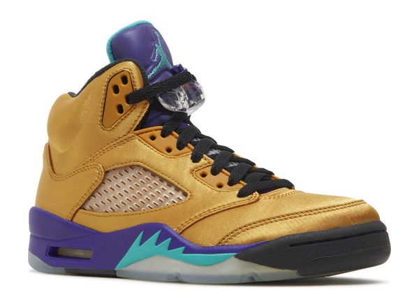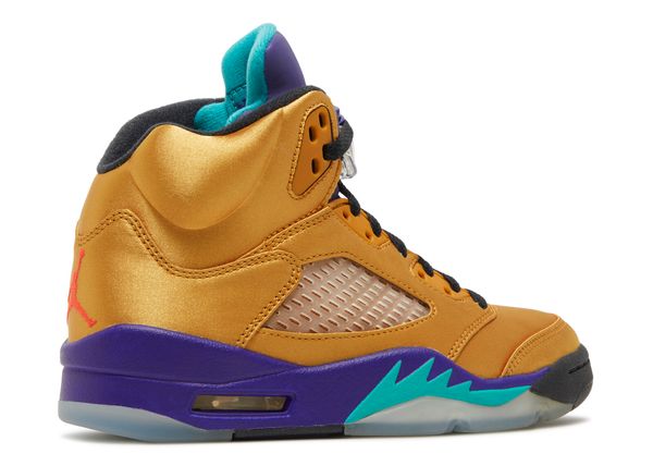 Crafted to celebrate the 50th birthday of actor and rapper Will Smith, the Air Jordan 5 Retro ‘Fresh Prince of Bel-Air’ Friends & Family edition reimagines Michael Jordan’s fifth signature sneaker in a limited production of only 23 pairs. Its upper arrives in a luxurious gold satin while the tongue and midsole offer purple and teal accents. Underfoot, a translucent outsole is rounded out by an Infrared Jumpman logo on the heel.