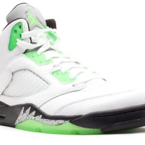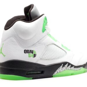 The Air Jordan 5 Retro ‘Quai 54’ dropped in 2011 as part of Jordan Brand’s annual collection dedicated to the Parisian streetball tournament. The mid-top features a white leather upper with neon green accents on the shoe’s eyelets and translucent rubber outsole. Additional pops of Radiant Green appear on the Quai 54 heel embroidery and Jumpman logo atop the grey reflective tongue.