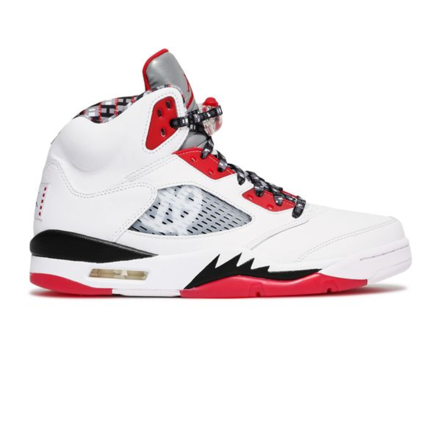 The Air Jordan 5 Retro ‘Quai 54’ 2021 released to celebrate the annual Parisian streetball tournament. The shoe’s upper is built with a white leather base, highlighted by University Red on the TPU eyelets and accented by a Quai 54 logo, partially visible through the quarter panel netting. The inner lining and laces add an abstract print to the design, while reflective detailing marks the tongue. Underfoot, visible Air in the heel offers cushioning, giving way to a Quai 54-branded translucent rubber outsole for traction.