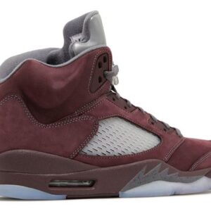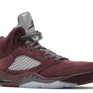 The Air Jordan 5 Retro SE ‘Burgundy’ for 2023 reintroduces a color scheme that originally launched in 2006. The classic design showcases an upper in burgundy suede, intersected on the side panel with ventilated clear netting and complemented by contrasting stitching. The polyurethane midsole matches the color scheme and displays speckled shark-tooth detailing with a visible Air-sole unit in the heel. The outsole delivers optimal grip with its clear herringbone traction pattern. The heel overlay and tongue are adorned with stitched Jumpman branding with reflective properties that enhance visibility in darker conditions.