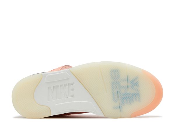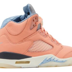 The DJ Khaled x Air Jordan 5 Retro ‘Crimson Bliss’ sees a classic silhouette through a new lens, in his ‘We the Best’ collection. The upper in a vibrant coral leather is contrasted with a silky quilted lining in Leche Blue, with the heel overlays adorned with a blue embroidered Nike Air logo on the right and ‘We the Best’ on the left. The silver reflective tongue features the classic Jumpman branding, and the translucent rubber outsoles complete the playful logo treatment with additional Jumpman and ‘We the Best’ branding. Underfoot, an off-white polyurethane midsole with blue speckled shark-tooth detailing is complemented by a visible Air-sole unit in the heel.