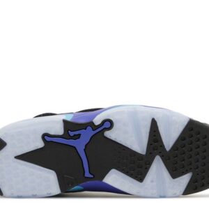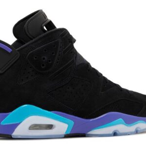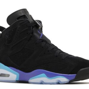 Inspired by the original Air Jordan 8 colorway, the Air Jordan 6 Retro ‘Aqua’ reflects Michael Jordan’s inaugural championship sneaker with a black nubuck upper and back-heel Jumpman branding. Concord and Aquatone hues grace the polyurethane midsole, which has visible Air-sole cushioning in the heel and is supported by a translucent rubber outsole. Lace locks, a pull tab reminiscent of a spoiler, and a molded tongue with two grip openings showcase classic AJ6 details.