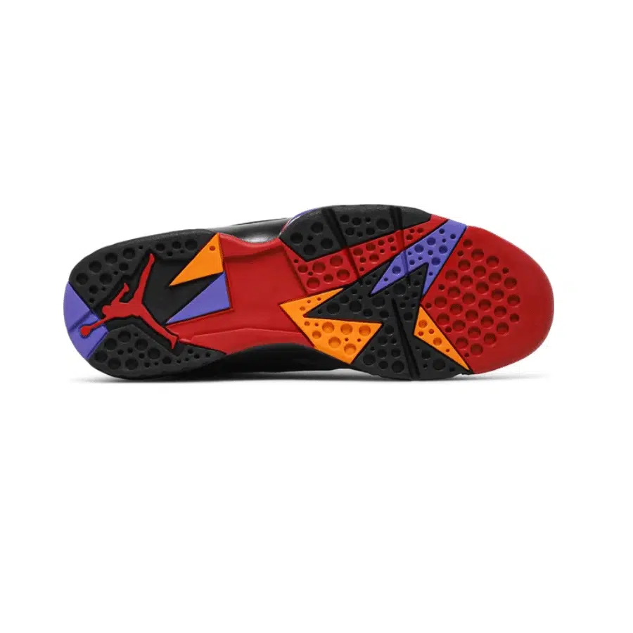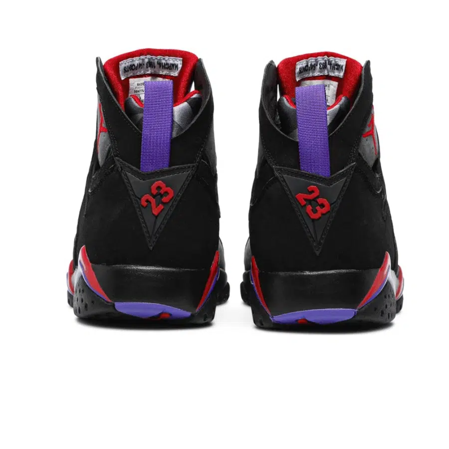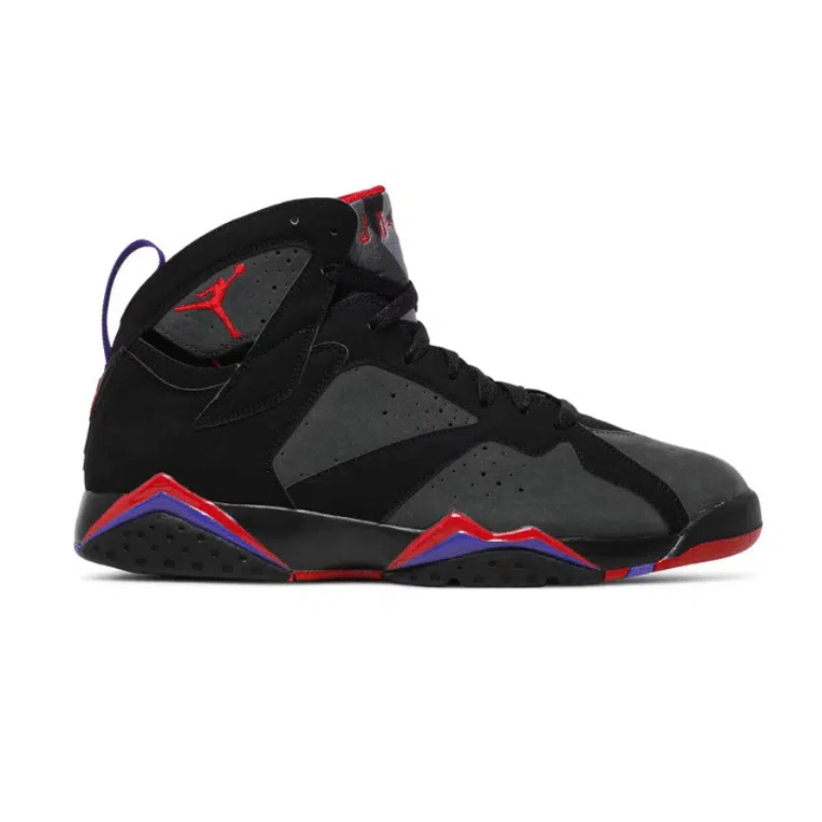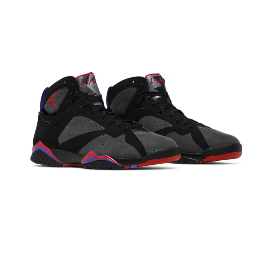 This Air Jordan 7 edition was published in the Defining Moments Package. There were two colorways in the collection: one based on the Toronto Raptors uniform and the other on the Orlando magic. This half of the set, the Raptors edition, displays a nubuck upper black and charcoal, with red hits on the center and the Jumpman logo. The internal sleeve of a neoprene is labeled with the tongue lettering ‘ JORDAN. ‘