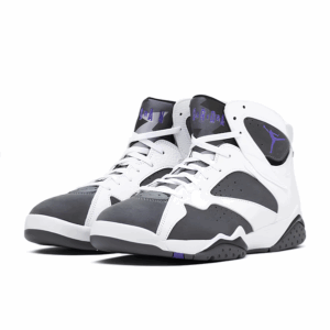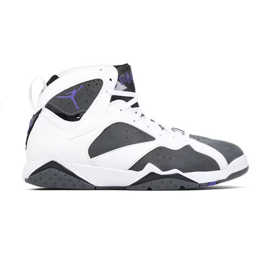 Originally released in 2006, the Air Jordan 7 Retro ‘Flint’ 2021 brings back the largely neutral look with this May 2021 drop. The shoe’s upper is built with a suede base, finished in Flint Grey and overlaid by contrasting white tumbled leather. The branding adds Varsity Purple to the design, while perforations throughout are included for breathability. Underfoot, the polyurethane midsole houses Air in the heel for cushioning, with a rubber outsole offering traction.