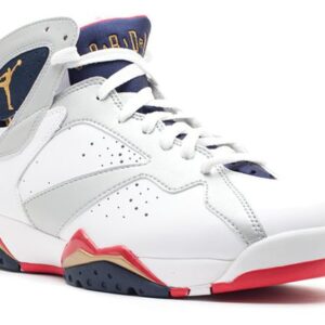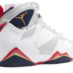 The 2012 Air Jordan 7 ‘Olympic’ is a retro release of Michael Jordan’s shoe at the 1992 Olympic Games on the way to a gold medal with the Dream Team. The design features an upper white and metal silver with accents from Obsidian, metallic gold, and True Red. The sneaker released in July 2012 and also includes the Olympic Jersey number ‘9’ on the heel. The ‘Olympic’ originally released in 2004 and also dropped in a 2016 ‘Tinker Alternate’ colorway combining a white / navy upper with a sprinkled midsole.