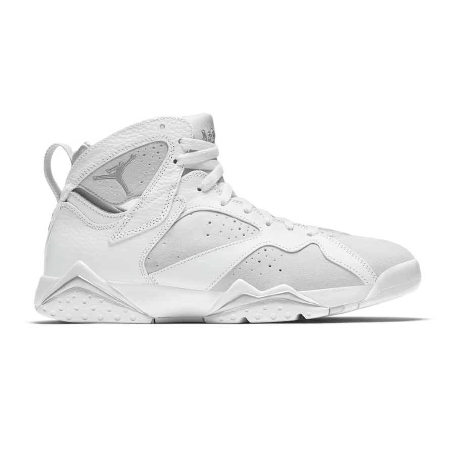 The Air Jordan 7 Retro ‘Pure Money’ emerges in the iconic subdued colorway, featuring a white tumbled leather upper complemented by Pure Platinum suede panels. Both colors also appear on the signature midsole detailing, while the branding adds a touch of metallic silver.
