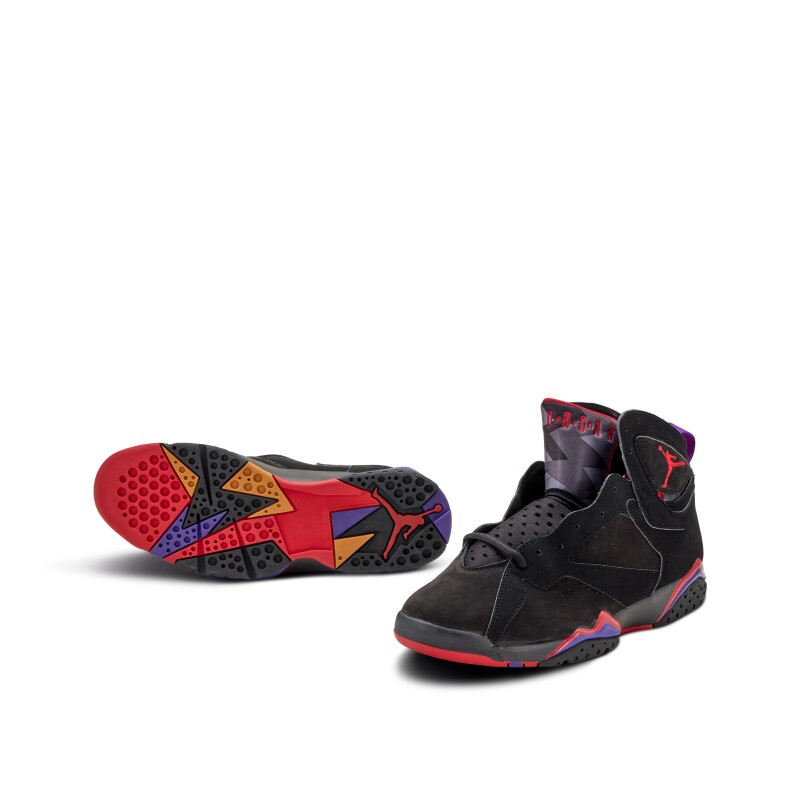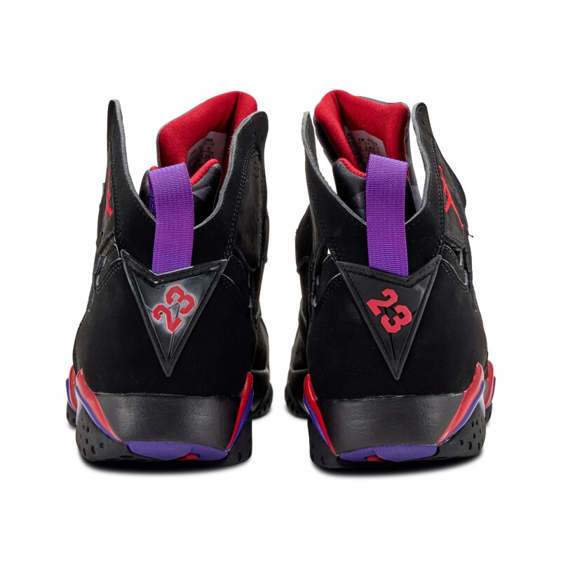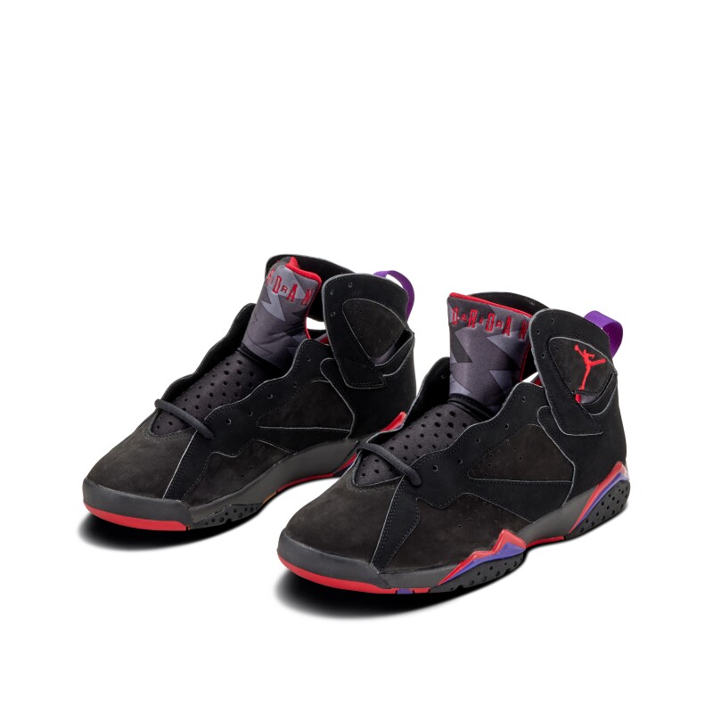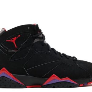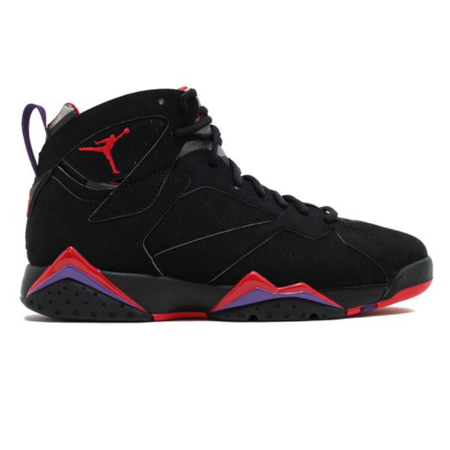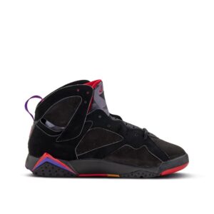The 2012 Nike Air Jordan 7 ‘Raptor’ provides a retro-released version of the OG 1992 colorway. The design combines an upper black nubuck with accents from True Red and Club Purple. The colorway takes its nickname from its resemblance to the colors of the Toronto Raptors team.