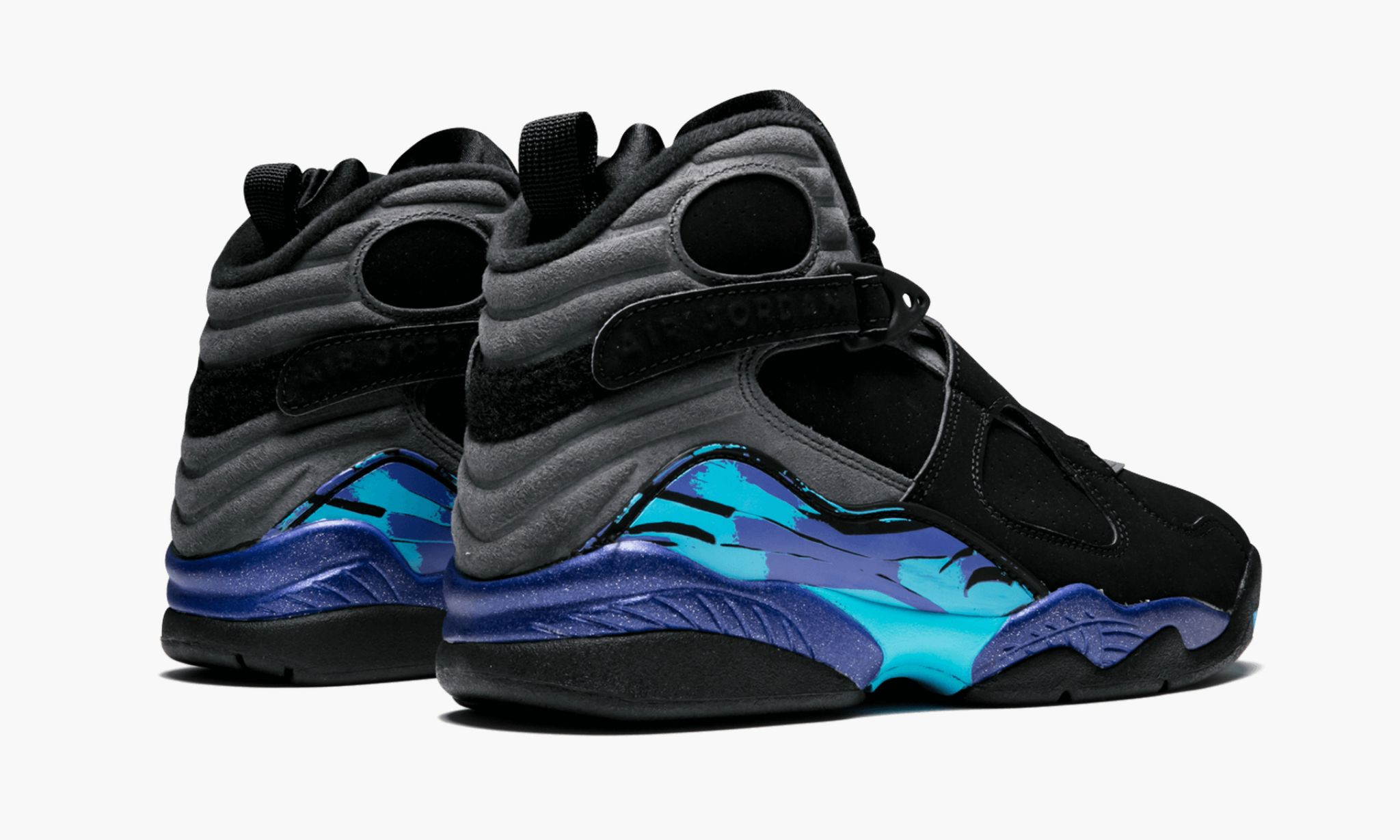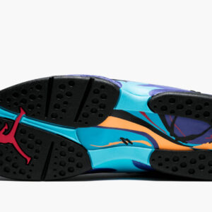 The 2025 version of the Air Jordan 8 Retro ‘Aqua’ uses teal and purple hues on the foam midsole, which packs Nike Air in the forefoot and heel areas. Loyal to the original 1993 design, these sneakers have a black and grey nubuck upper secured with a unique cross-strap design. The signature multicolor chenille tongue tag is stamped with a red Jumpman logo, and a teal support panel that sports purple brush strokes.
