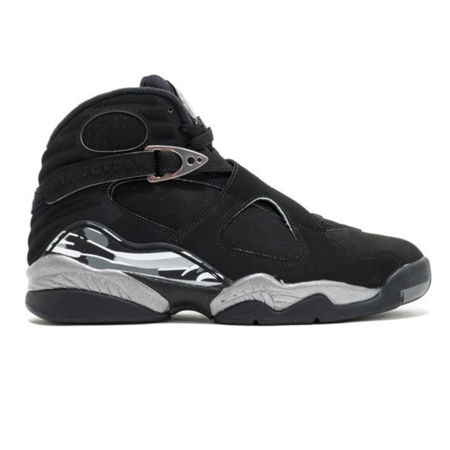 Best known for being worn by Kobe Bryant during the 2003 playoffs, the Air Jordan 8 Retro ‘Chrome’ 2015 was retroed in 2015 as part of Nike’s Holiday 2015 collection. The all-black upper emerges in smooth and perforated nubuck, with chrome on the buckle of the ankle strap. The midsole shank and midsole sport more complementary grey and silver.