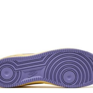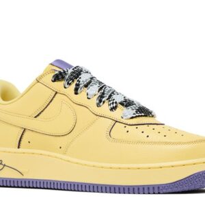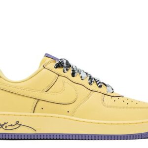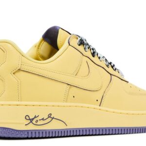The Kobe Bryant x Nike Air Force 1 Low Protro ‘Mamba Mentality’ makes use of ReactX foam insoles paired with a rubber cuposole highlighted by Kobe Bryant’s signature on the sidewall. These shoes have a pale yellow leather upper secured with graphics on the laces and accented with purple accents along the edges. An oversized ‘8’ lands on the heel as a nod to Kobe’s old jersey number, while his sheath logo appears on the tongue tag for a signature look.