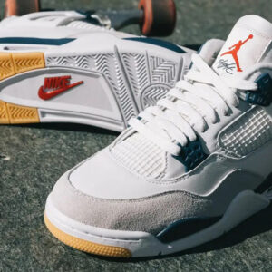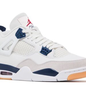 The Nike SB x Air Jordan 4 Retro SP ‘Navy’ sports a white leather upper with a grey suede forefoot overlay and side panel netting. A red Jumpman embellishes the tongue, while an embossed Nike SB logo adorns the navy heel tab. More navy accents decorate the eyelets and foam midsole, which showcases a visible Nike Air unit in the heel. A herringbone-patterned outsole uses gum rubber in high-wear areas for enhanced durability.