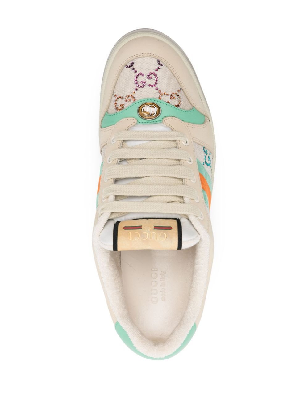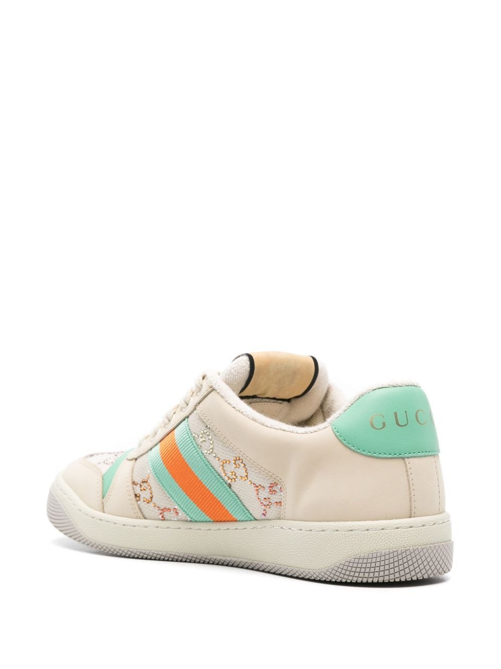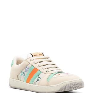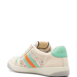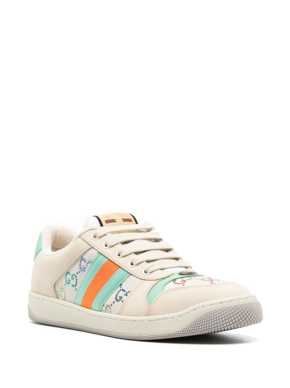 Influenced by classic trainers from the '70s, the Screener sneakers—named for the defensive sports move— famously feature the Web stripe on the side and the vintage Gucci logo. This iteration boasts a multicolour embellished iteration of the Supreme GG logo while the Web stripe appears in a plafyul turquoise and orange colourway.